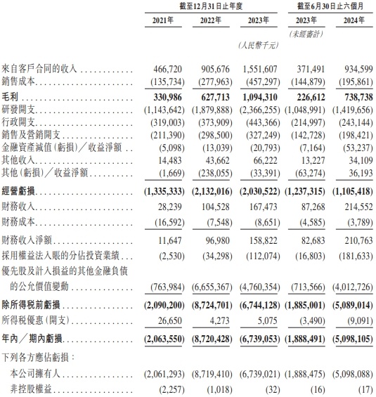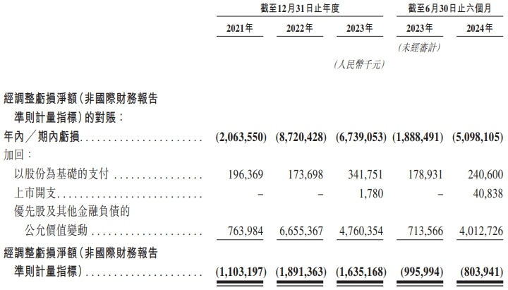 2021年、2022年、2023年和2024年1-6月,地平线机器人收入分别为4.67亿元、9.06亿元、15.52亿元和9.35亿元,期内亏损分别为20.64亿元、87.20亿元、67.39亿元和50.98亿元,经调整亏损净额(非国际财务报告准则计量指标)分别为11.03亿元、18.91亿元、16.35亿元和8.04亿元。