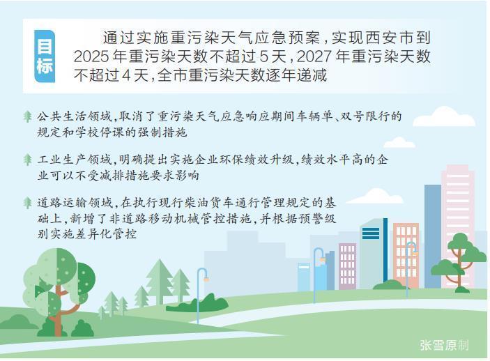 “修订后的《应急预案》主要围绕1个目标,明确2种预警发布程序,调整3个等级的预警分级标准,优化4个领域管控。”西安市生态环境局副局长顾金龙介绍,“1个目标”是指,通过实施重污染天气应急预案,实现西安市到2025年重污染天数不超过5天,2027年重污染天数不超过4天,全市重污染天数逐年递减的目标任务;“2种预警发布程序”指市级预警和上级区域预警;“3个等级的预警分级标准”是指,原预案有2个预警分级指标,即空气质量指数(AQI)或细颗粒物(PM2.5)浓度,修订后只有空气质量指数(AQI),预警级别从低到高依次为黄色、橙色和红色预警;“4个领域管控”是指,在公共生活领域、工业生产领域、道路运输领域、城市面源领域加强相关举措。