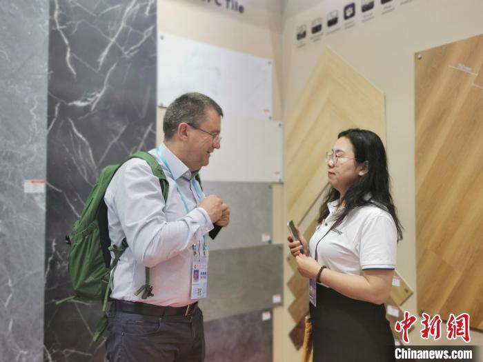 在石家庄德卡诺装饰材料有限公司(下称“德卡诺”)展位上,众多境外采购商驻足咨询,有的还拿出手机进行现场直播。