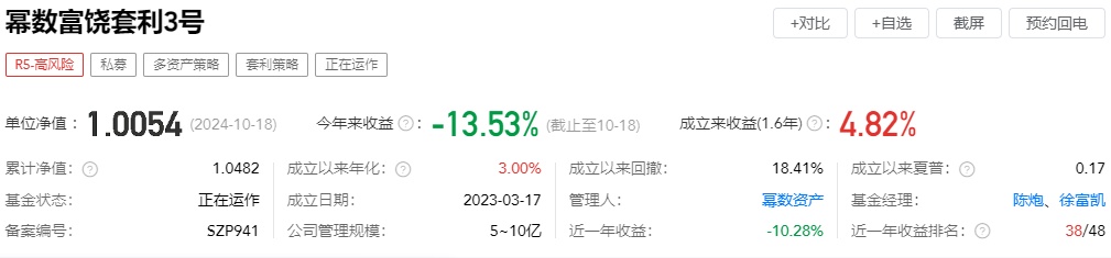 据私募排排网显示,幂数资产旗下仅有一只幂数富饶套利3号有公开数据,该基金成立于2023年3月17日,从最新的截至2024年10月18日收盘看,该基金年内收益率为-13.53%,累计收益率仅有4.82%。