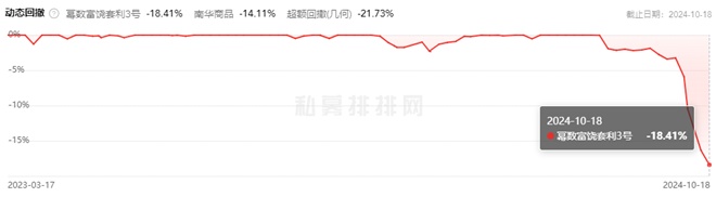 从动态回撤来看,幂数富饶套利3号从成立后一直到7月份都保持稳定,今年9月20日的回撤也仅有3.25%,但之后就呈现加速下跌,到10月18日达到目前的最大值-18.41%。