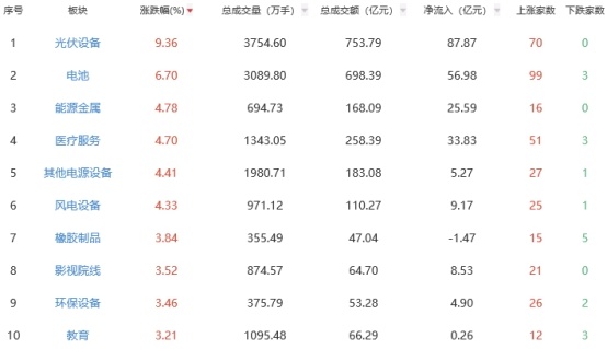板块方面,光伏设备、电池、能源金属等板块涨幅居前,保险、贵金属、银行等板块跌幅居前。