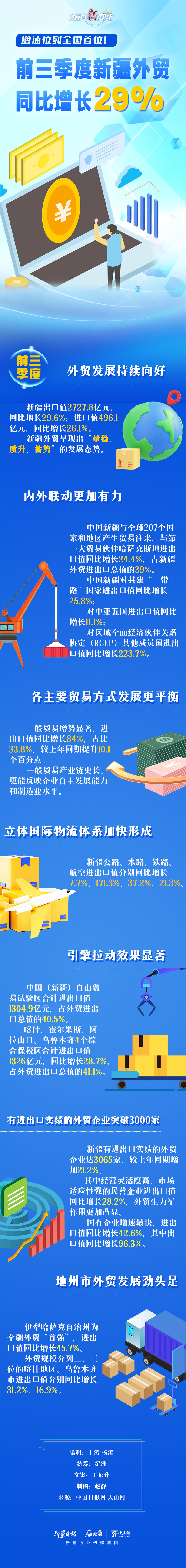前三季度,新疆外贸进出口总值3223.9亿元,同比增长29%,外贸规模创历史同期新高,增速位列全国首位。哪个地州是全疆外贸“首强”?民营企业外贸情况怎样?今天的《数说“新”变化》带你来了解。