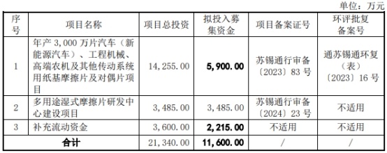 林泰新材拟在北交所募资11,600.00万元,用于“年产3,000万片汽车(新能源汽车)、工程机械、高端农机及其他传动系统用纸基摩擦片及对偶片项目”“多用途湿式摩擦片研发中心建设项目”和“补充流动资金”。
