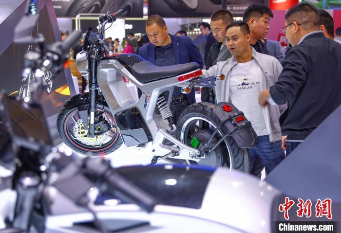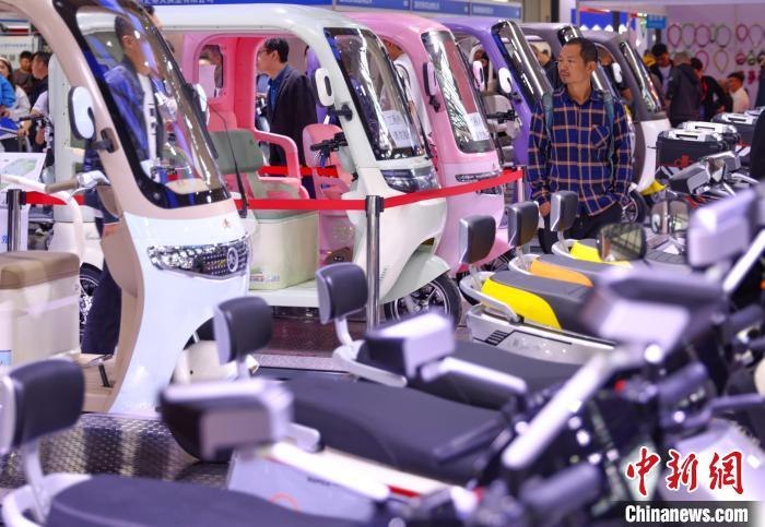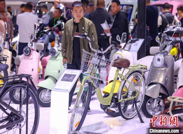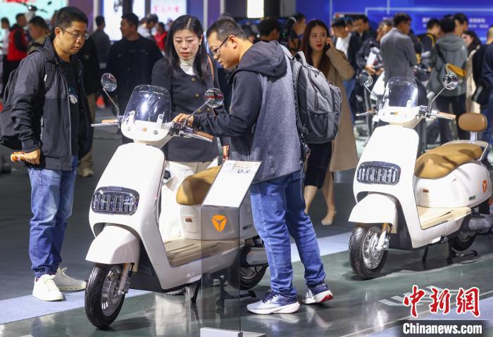 10月25日,以“从新出发,拥抱未来”为主题的第41届中国江苏国际新能源电动车及零部件交易会在南京国际博览中心开幕,涵盖了自行车、电动两轮车、电动三轮车、低速四轮车及零配件等,为电动车品牌和零部件供应商搭建了一个展示实力、抢抓机遇、开拓市场的平台。图为观众参观展出的电动两轮车。中新社记者 泱波 摄