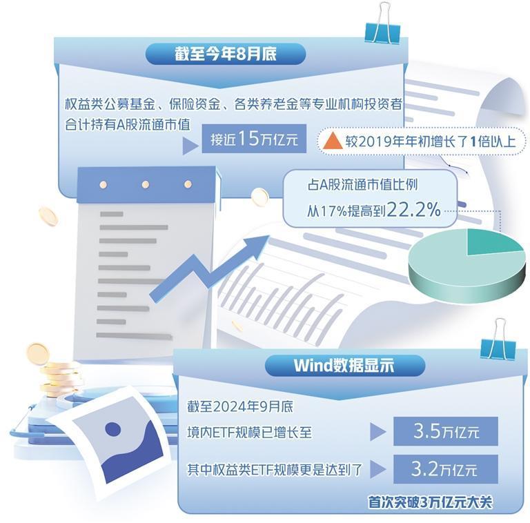 “近年来,证监会大力促进发展权益类公募基金,会同有关方面持续推动中长期资金入市,取得了一些阶段性成效。”吴清在9月24日举行的国新办新闻发布会上表示,截至今年8月底,权益类公募基金、保险资金、各类养老金等专业机构投资者合计持有A股流通市值接近15万亿元,较2019年年初增长了1倍以上,占A股流通市值比例从17%提高到22.2%。