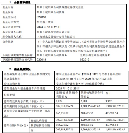 募集期间净认购金额1,918,372,723.91元,认购资金在募集期间产生的利息473,906.54元,募集份额合计1,918,846,630.45份。