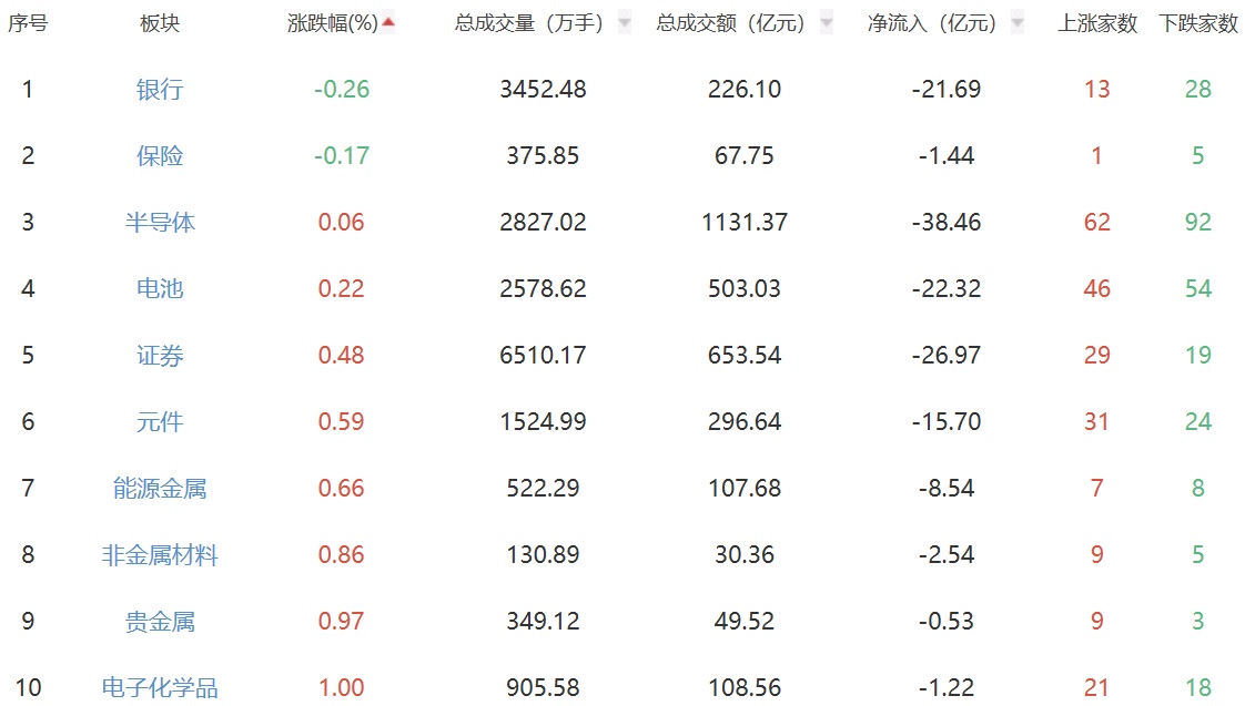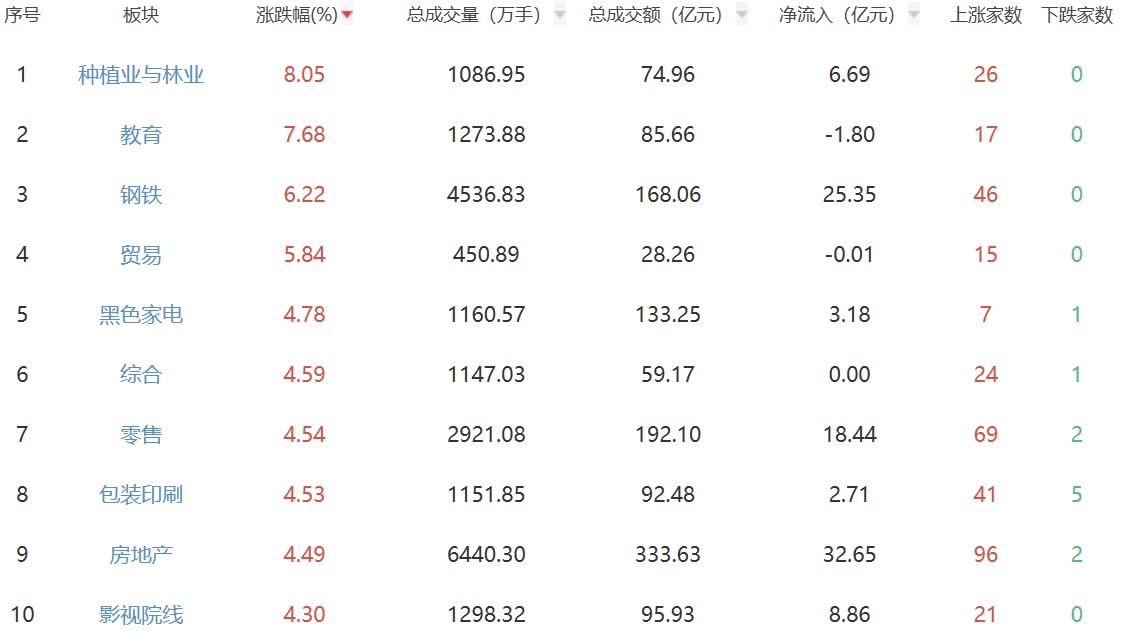 板块方面,种植业与林业、教育、钢铁板块涨幅居前,保险、银行板块跌幅居前。
