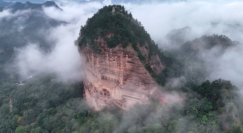 西秦岭支脉小陇山深处,一座形似麦垛的山峰坐落于群山之间。其上数以万计的造像穿越历史,诉说着一段历久弥新的传奇。