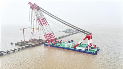 “二航卓越”起重机吊起2500吨钢吊箱。 (湖北日报通讯员 杨雪 摄)