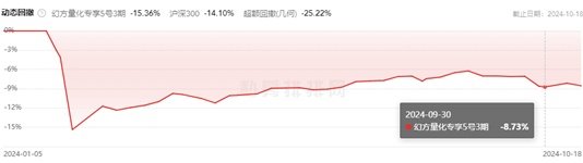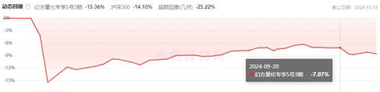 从动态回撤来看,股票策略基金—幻方量化专享5号3期在9月20日当天的回撤值为-7.07%,到9月30日为-8.73%,回撤值扩大了-1.66%。