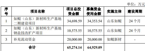 如鲲新材原拟在上交所科创板公开发行不超过1,995.80万股,原拟募集资金64,929.09万元,计划用于如鲲(山东)新材料生产基地二期建设项目、如鲲(山东)新材料生产基地钠盐技改扩产项目、补充流动资金。