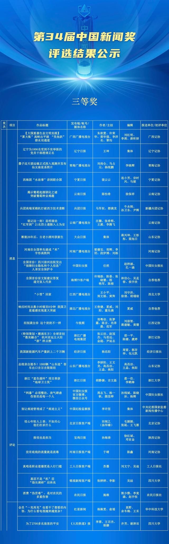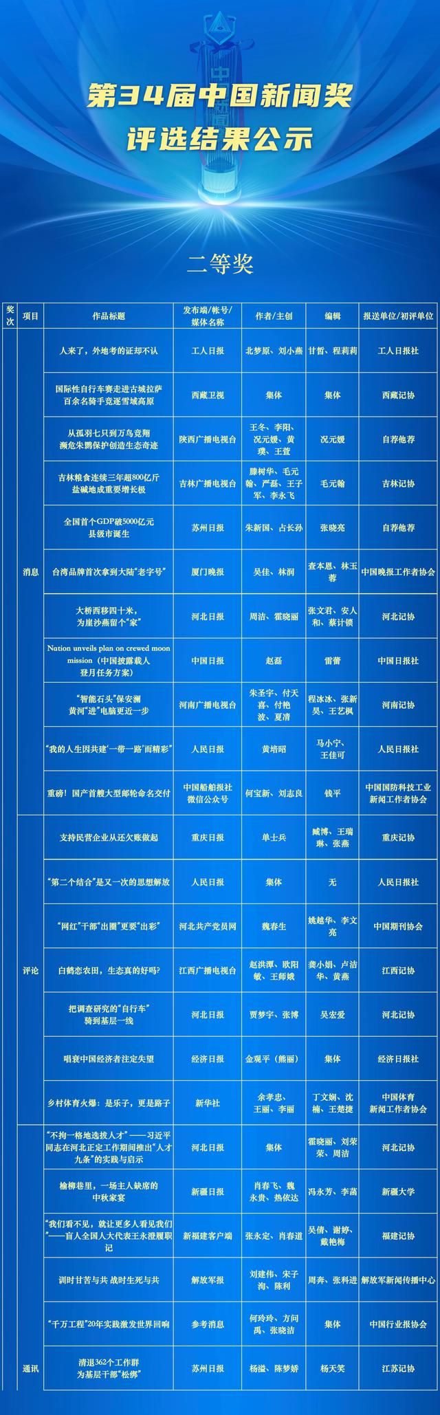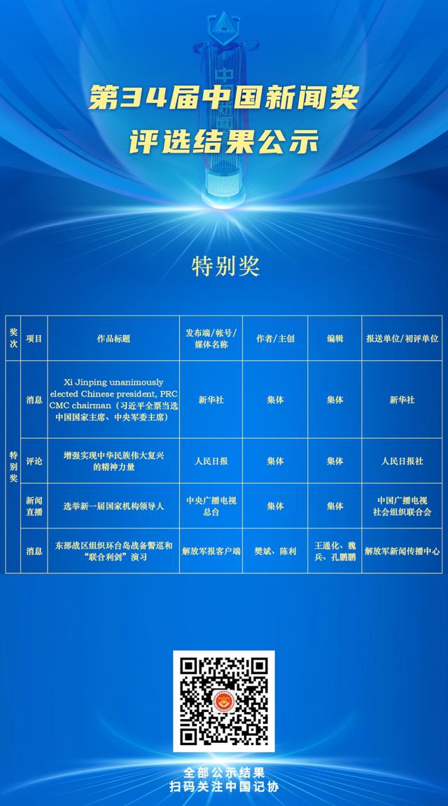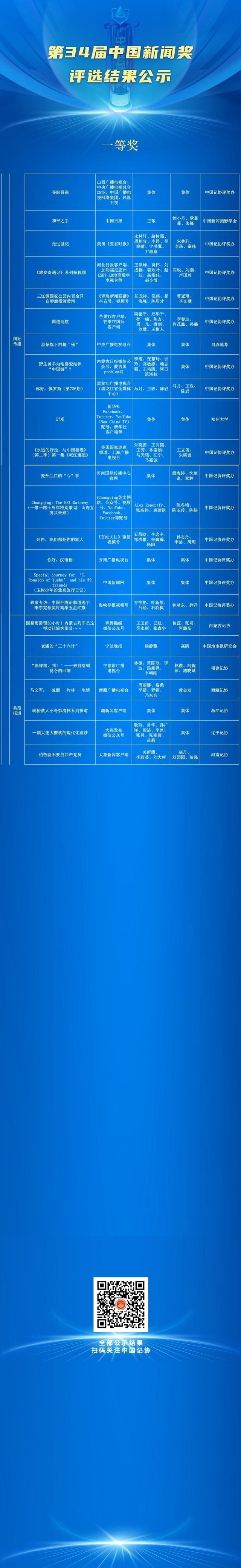 关于公示第34届中国新闻奖评选结果的公告