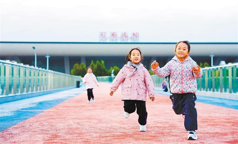 10月19日,小朋友在石家庄高铁片区中央绿色体育公园空中绿道奔跑。近年来,石家庄新建了近1000个各具特色的运动场,并建设了101公里的城市环城绿道,让市民在家门口实现“运动自由”。