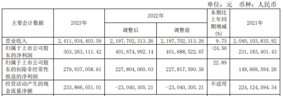 2023年,应流股份实现营业收入24.12亿元,同比增长9.75%;归属于上市公司股东的净利润3.03亿元,同比下降24.50%;归属于上市公司股东的扣除非经常性损益的净利润2.80亿元,同比增长22.89%;经营活动产生的现金流量净额2.34亿元,上年同期为-2304.03万元。