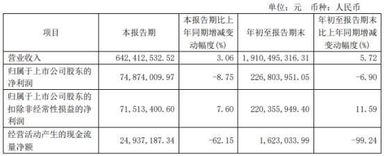 应流股份昨晚披露的2024年第三季度报告显示,公司前三季度实现营业收入19.10亿元,同比增长5.72%;归属于上市公司股东的净利润2.27亿元,同比下降6.90%;归属于上市公司股东的扣除非经常性损益的净利润2.20亿元,同比增长11.59%;经营活动产生的现金流量净额162.30万元,同比下降99.24%。