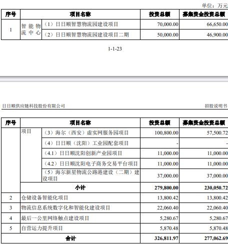 日日顺原拟在深交所创业板发行股票数量不超过6,561.83万股(行使超额配售选择权之前),原拟募集资金277,062.69万元,计划用于智能物流中心项目、仓储设备智能化项目、物流信息系统数字化和智能化建设项目、最后一公里网络触点建设项目 、自营运力提升项目。