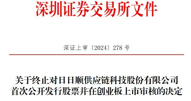 深交所于2021年5月12日依法受理了日日顺首次公开发行股票并在创业板上市的申请文件,并依法依规进行了审核。日前,日日顺向深交所提交了《日日顺供应链科技股份有限公司关于撤回首次公开发行股票并在创业板上市申请文件的申请》,保荐人向深交所提交了《中国国际金融股份有限公司关于撤销保荐日日顺供应链科技股份有限公司首次公开发行股票并在创业板上市的申请》《招商证券股份有限公司关于撤销保荐日日顺供应链科技股份有限公司首次公开发行股票并在创业板上市的申请》。根据《深圳证券交易所股票发行上市审核规则(2024年修订)》第六十二条的有关规定,深交所决定终止对日日顺首次公开发行股票并在创业板上市的审核。