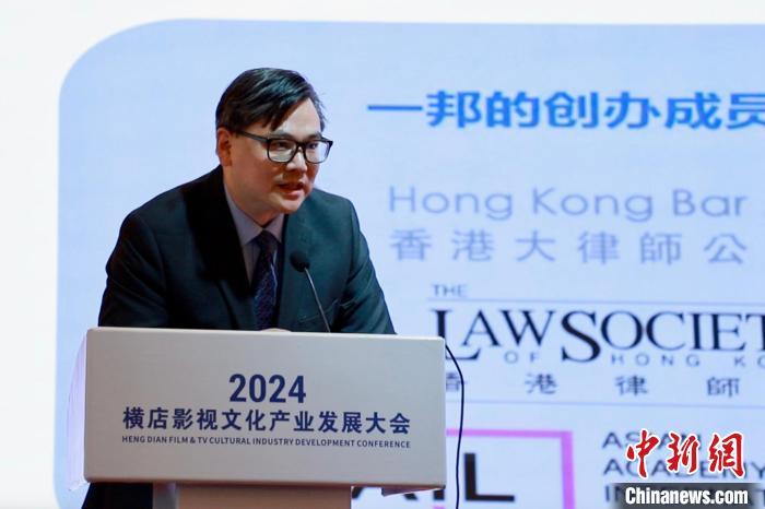 2024横店影视文化产业发展大会现场,香港一邦国际网上仲调中心有限公司首席技术官梁振声发言。刘子琳 摄