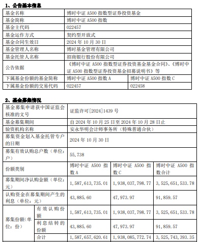 中国经济网北京10月31日讯 今日,博时基金管理有限公司发布博时中证A500指数型证券投资基金基金合同生效公告。