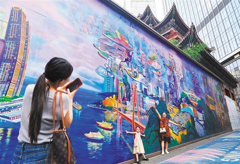 ⑤9月24日,游客在解放碑妙街拍照打卡。解放碑商圈以地标IP、文化艺术为亮点,打造多元特色、引领时尚的消费场景。