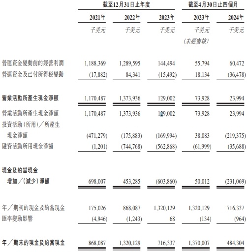 2021年、2022年、2023年和2024年1-4月,德翔海运营业活动所产生现金净额分别为11.70亿美元、13.74亿美元、1.29亿美元和2399.4万美元。