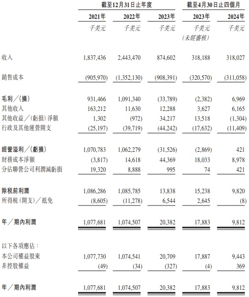 2021年、2022年、2023年和2024年1-4月,德翔海运收入分别为18.37亿美元、24.43亿美元、8.75亿美元和3.18亿美元,期内利润分别为10.78亿美元、10.75亿美元、2038.2万美元和981.2万美元。