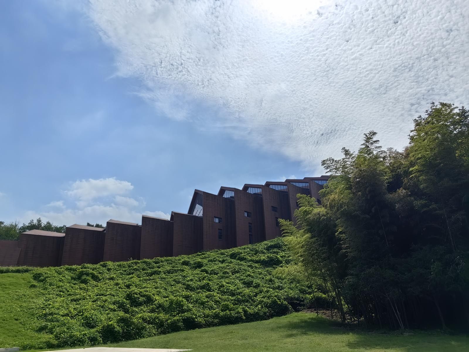 龙窑是古代南方最流行的一种窑炉形式,依山势而建,形状似龙,由此得名。具有温度较高、产量大的特点。繁昌窑遗址展示馆沿山而建,通体赭红,初秋的柯家冲还是满目苍翠,展示馆掩映在半山腰的竹林之后,真的如一条火龙,潜藏在长江之滨。