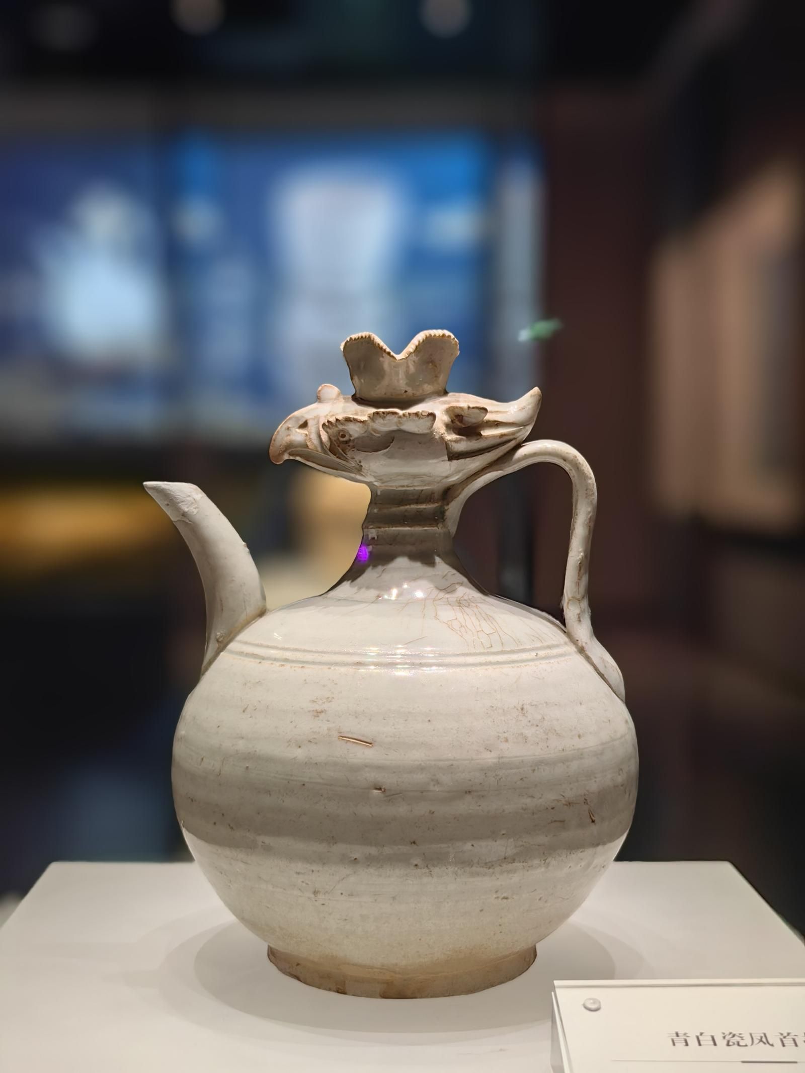 一件是宋代的荷花托盏,像一朵盛开的莲花,翻过来又像是一个莲蓬,是繁昌窑的代表之作。而另一件国家一级文物凤首壶,造型非常优美,据介绍是模仿唐代金银器的器形来制作的,颇有几分波斯风情。