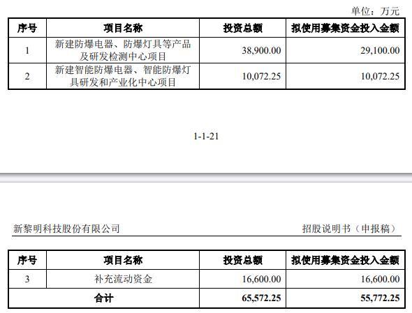 新黎明本次发行原计划不超过4,559.40万股,且不低于本次发行后总股本的25%。本次发行全部为新股发行,不涉及股东公开发售股份的情形。新黎明原拟募集资金55772.25万元,分别用于“新建防爆电器、防爆灯具等产品及研发检测中心项目”、“新建智能防爆电器、智能防爆灯具研发和产业化中心项目”、补充流动资金。