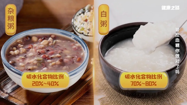 杂粮里面的碳水化合物含量一般相对比较低,相同的容积或者相同的体积的情况下,杂粮粥比白粥里面的糖分更少,而且杂粮里面的纤维素相对比较多,喝了以后会延缓吸收。
