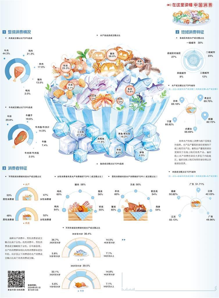 不同性别用户偏好购买不同的肉类水产品。数据显示,男性消费者偏好购买蟹类、羊肉类、贝类、软足类和海参产品。女性消费者更关注家庭消费,鸭肉、鸡肉、猪肉等日常家庭烹饪食用的肉类水产消费占比更高。