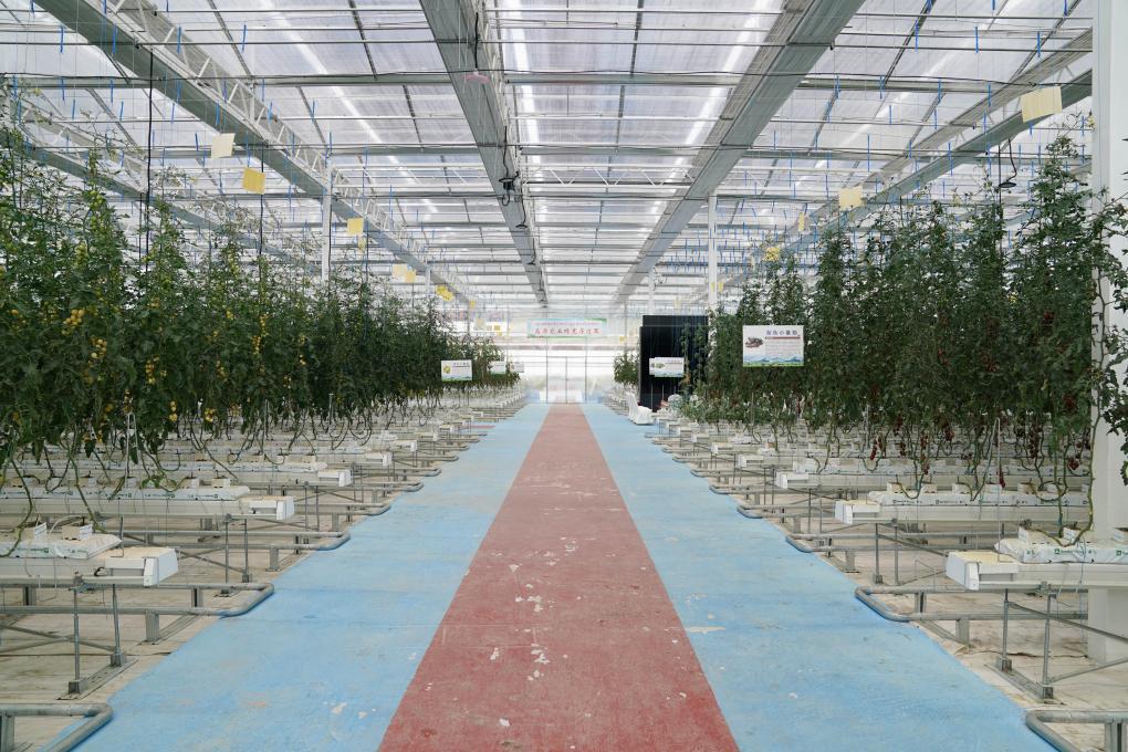 位于理塘县现代农业园区内的智慧农业无土栽培馆,馆内种植有多种颜色的小番茄、水果黄瓜和西瓜等水果。新华社记者 胥冰洁 摄