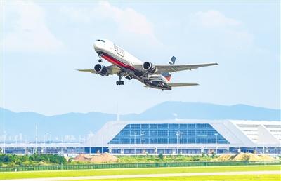 一架B767-300型全货机近日从鄂州花湖国际机场起飞,前往印度新德里。(湖北日报全媒记者 薛婷 摄)
