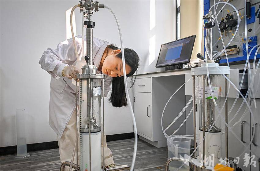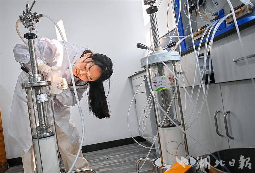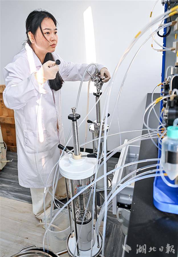 植物源重组人血清白蛋白定向储存于水稻胚乳细胞的蛋白体中,根据其理化特性,加入水溶性缓冲盐提取液,在高温和低pH条件下提取获得粗提物,之后经过国际领先的三步(阳离子、阴离子、疏水)柱层析工艺,获得高度纯化的人血清白蛋白。(湖北日报全媒记者 朱熙勇 通讯员 陈登梅 摄)