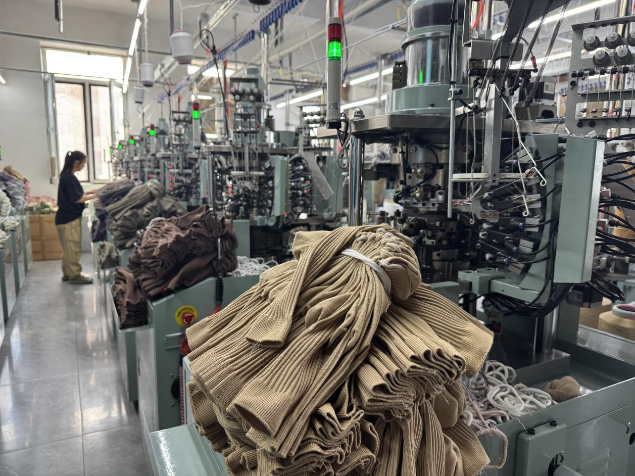 当前,小北河镇的一些袜企不断加大投入“智改数转”,正逐步从4代电脑机向5代智能机升级,全新的产业活力不断释放。澳笠森袜业的生产车间里,织袜工人庞大姐把生产好的袜子整理好拿到成品区:“不到3分钟,就能织出一双棉袜,我一个人能管十几台机器。”