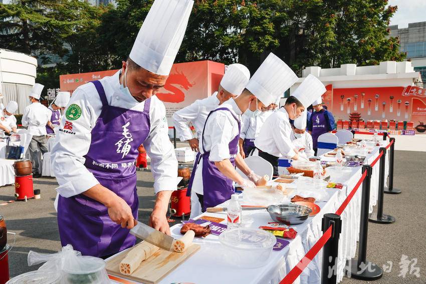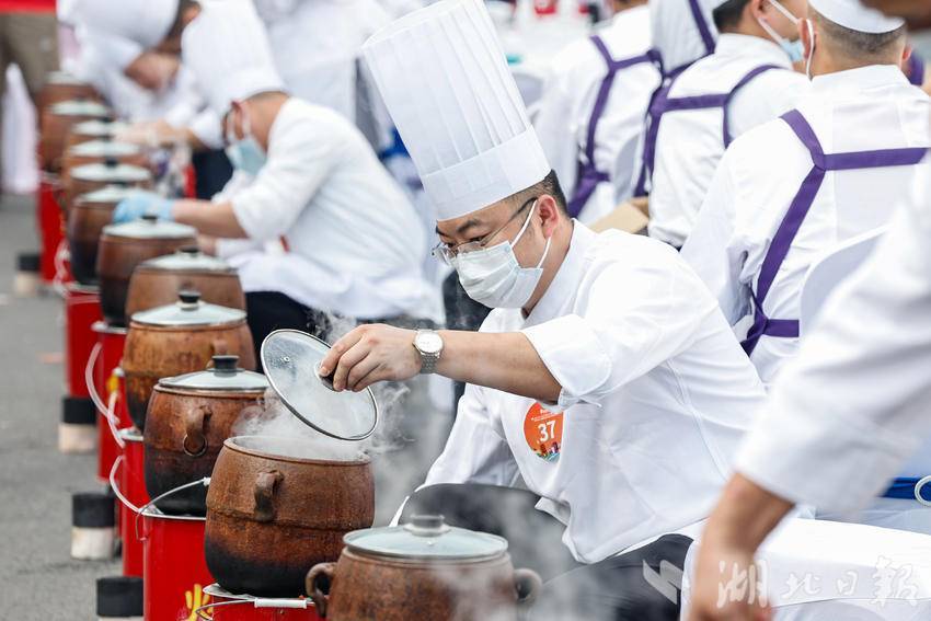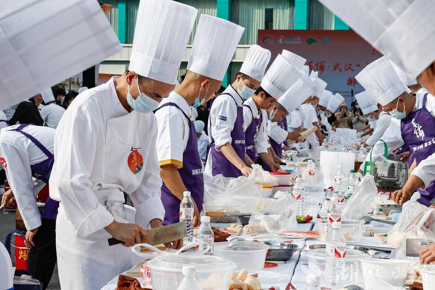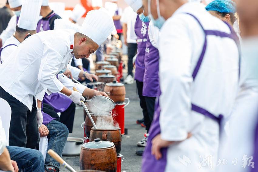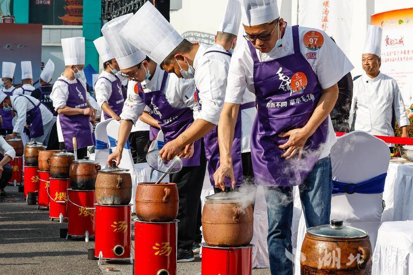 2024年11月13日,在武汉杂技厅门前广场上,100位大厨、100个煤炉、100个砂铫一字排开,同煨着100罐排骨藕汤。当日,来自武汉的100家知名餐厅大厨上演“百人百炉百厨同煨排骨藕汤”的大比拼,这也为武汉“十大名菜”餐厅争霸赛拉开序幕。据介绍,此次武汉“十大名菜”餐厅争霸赛将持续近两个月,后续还有辣得跳、鱼头泡饭、黄陂三鲜、油焖小龙虾、清蒸武昌鱼、珍珠圆子、红烧甲鱼、腊肉炒洪山菜苔、新农牛肉等九场争霸赛。武汉将持续通过餐厅争霸赛、发布美食地图等形式,推动武汉“十大名菜”进商圈商街、“四站一场”、景区景点等,让更多人能够品尝到地道的武汉风味,进一步推动武汉餐饮业高质量发展。(湖北日报全媒记者 倪娜 通讯员 周王 马学东 摄)