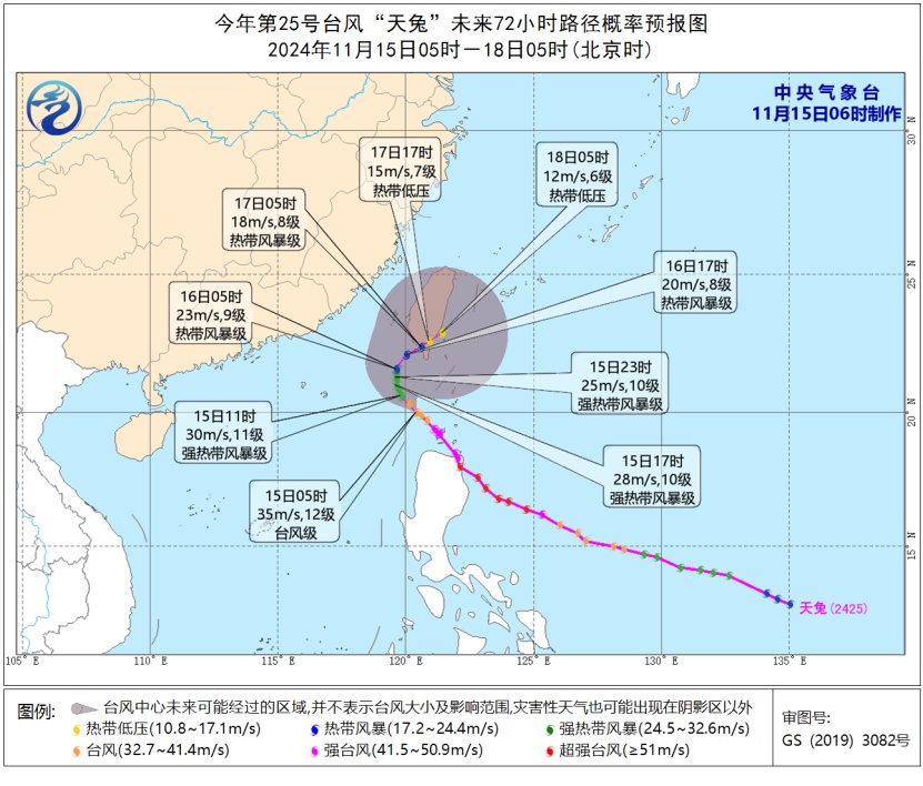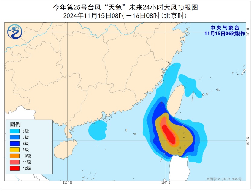 台湾海峡、巴士海峡、南海东北部及西北部的部分地区、福建北部沿海、台湾岛西南部和东北部沿海将有6~8级大风,阵风8~10级; “天兔”中心经过的附近海域风力可达11~12级,阵风13~14级。