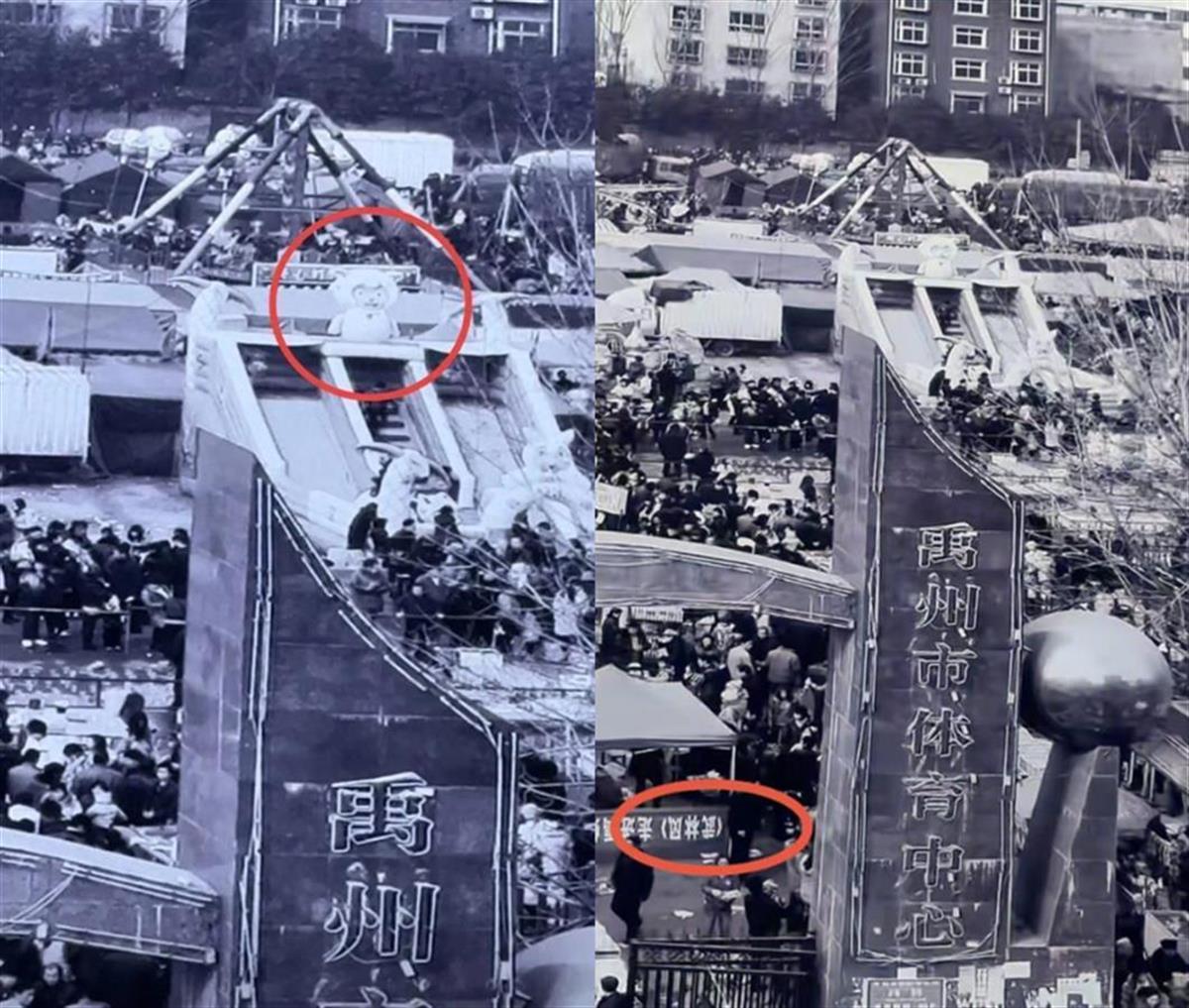 该网友表示,一幅作品标注为“1997年,禹州市老城区体育场春节期间的游玩场面”,但照片中却出现了“喜羊羊”雕塑,还有一条横幅上有着“武林风”字样。这些概念均是在几年之后的2004、2005年左右出现的。记者查询发现,《喜羊羊与灰太狼》于2005年8月首播,《武林风》首播时间为2004年1月。