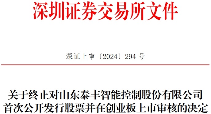 日前,泰丰智能向深交所提交了《山东泰丰智能控制股份有限公司关于撤回首次公开发行股票并在创业板上市申请文件的申请》,保荐人向深交所提交了《第一创业证券承销保荐有限责任公司关于撤回山东泰丰智能控制股份有限公司首次公开发行股票并在创业板上市的申请》。根据《深圳证券交易所股票发行上市审核规则(2024年修订)》第六十二条的有关规定,深交所决定终止对泰丰智能首次公开发行股票并在创业板上市的审核。
