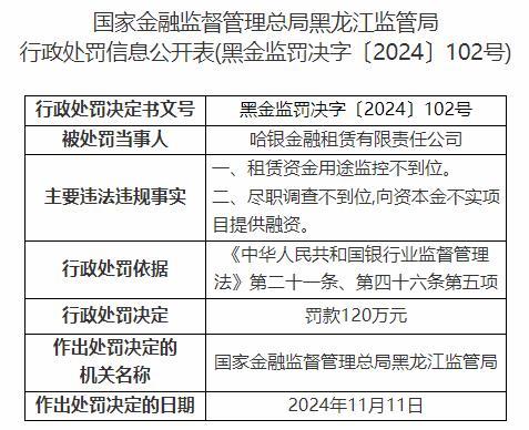 中国经济网北京11月22日讯 国家金融监督管理总局网站近日发布的国家金融监督管理总局黑龙江监管局行政处罚信息公开表(黑金监罚决字〔2024〕102号)显示,哈银金融租赁有限责任公司存在以下违法违规事实:一、租赁资金用途监控不到位。二、尽职调查不到位,向资本金不实项目提供融资。根据《中华人民共和国银行业监督管理法》第二十一条、第四十六条第五项的规定,国家金融监督管理总局黑龙江监管局决定对其处以罚款120万元。