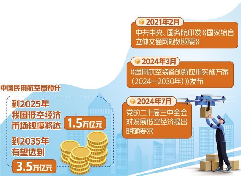 低空经济快速发展,离不开中央和地方一系列支持政策措施。2021年2月,中共中央、国务院印发《国家综合立体交通网规划纲要》,标志着低空经济正式上升为国家战略;2024年3月,《通用航空装备创新应用实施方案(2024—2030年)》发布,提出推动低空经济形成万亿级市场规模;党的二十届三中全会也对发展低空经济提出了明确要求。