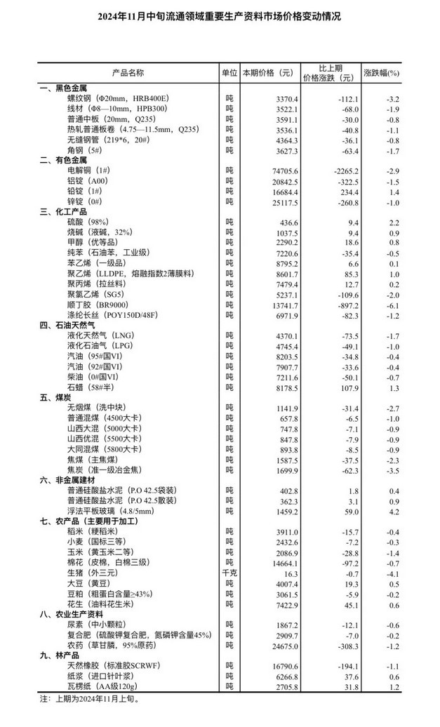 中新网11月24日电 据国家统计局微信公众号消息,据对全国流通领域9大类50种重要生产资料市场价格的监测显示,2024年11月中旬与11月上旬相比,15种产品价格上涨,35种下降。