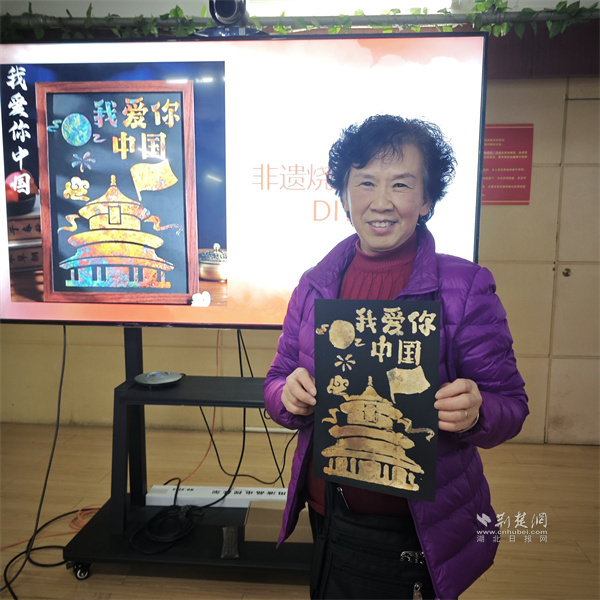 随后的非遗烧箔画制作环节中,手工老师详细介绍了烧箔画的起源、制作步骤及注意事项。在老师的耐心指导下,大家纷纷拿起工具,细心勾勒、涂抹、覆盖、按压,将“我爱你中国”的文字和“北京天坛”等图案绘制在箔纸上,在创作过程中感受优秀传统文化的魅力,厚植爱国情怀。