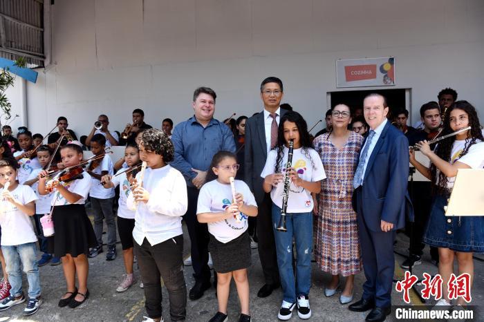 当地时间11月26日,巴西圣保罗佩鲁斯社区儿童民乐团演奏《友谊地久天长》。中国驻圣保罗总领事余鹏(二排左二)、巴西各界友人与小乐手合影。中新网记者林春茵摄