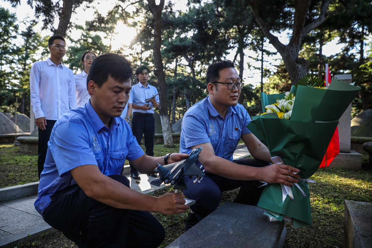 身穿“航空蓝”的方文墨为志愿军空军烈士孙生禄敬献花束,并将他的墓碑擦拭干净。随后,将一架沈飞生产的先进隐身战机“鹘鹰”的模型放在墓前。“我们要接过英雄的接力棒,把祖国建设得越来越好!”方文墨说。