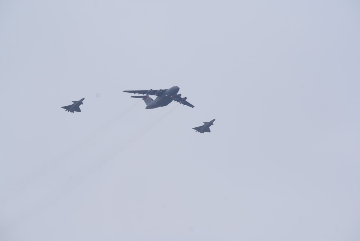 2023年,第十批在韩中国人民志愿军烈士遗骸回国,“运-20”和两架护航飞机“歼-20”。人民网记者 邱宇哲摄