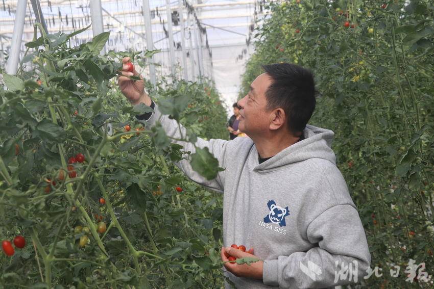湖北日报客户端讯(通讯员 程国辉)时至农历小雪前后,在应城市三合镇境内的湖北番茄公社数字农场智慧大棚里,一串串鲜红和青绿色的小番茄挂满枝头,生机盎然,引得不少游客前来采摘。