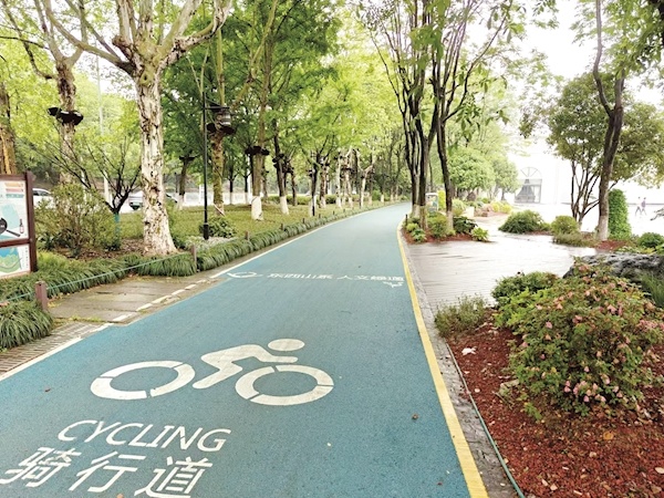 “我们新建改建了4千米的人文绿道,其中绿道主线长3430米为墨蓝色路面、支线长570米,为黑色路面。”武汉城建集团园发公司该项目负责人说,依托园区内部道路,人文绿道兼具骑行与步行功能,连通绿道主线与景区各景观节点。