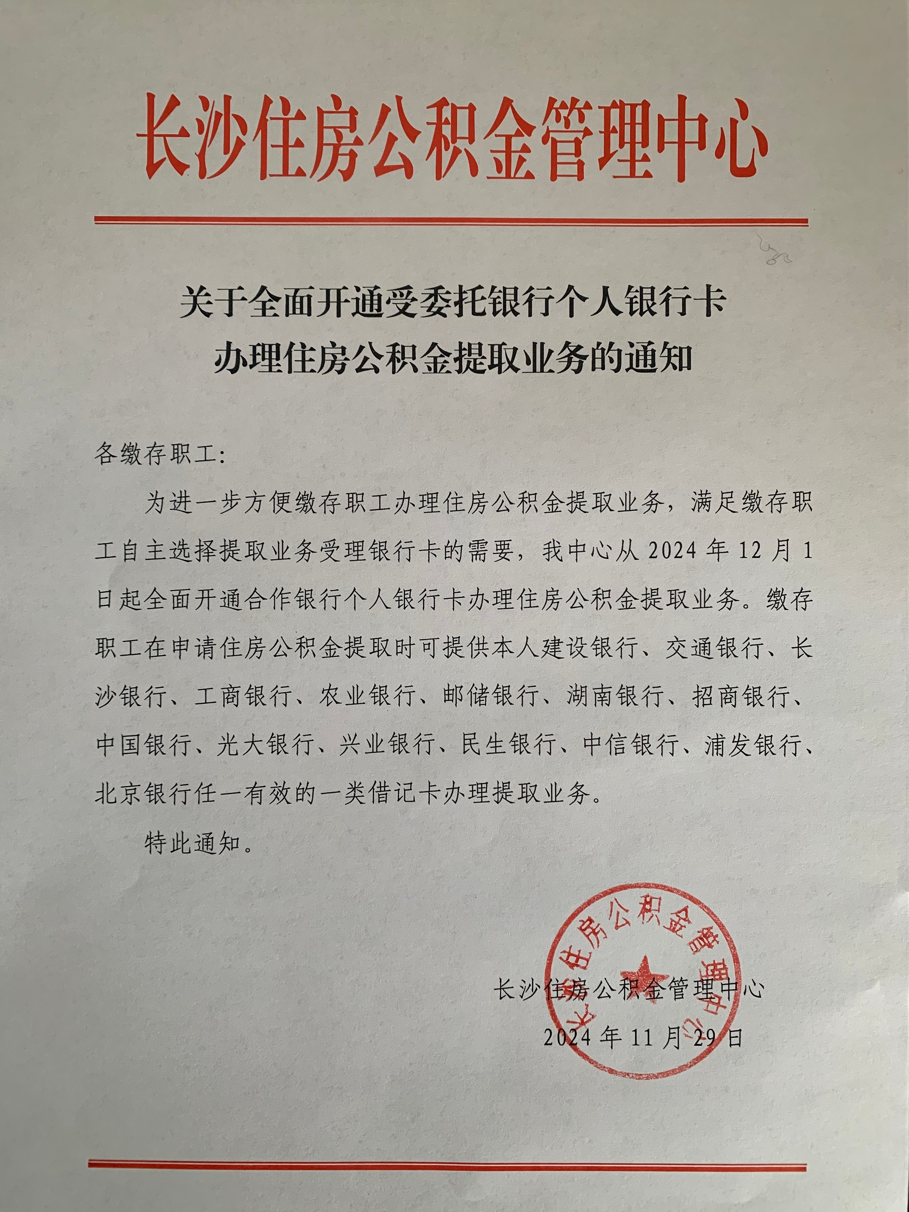 中新网11月29日电 长沙住房公积金管理中心11月29日发布《关于全面开通受委托银行个人银行卡办理住房公积金提取业务的通知》。通知明确,从2024年12月1日起全面开通合作银行个人银行卡办理住房公积金提取业务。全文如下: